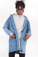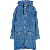 Kapuzenparka für Herren von Sixth June aus Denim-Material mit Knopfverschluss vorne. Übergroßer Schnitt, überschnittene Schultern, Cargotaschen mit Knopfverschluss und angedeutete Seitentaschen. Blaues Denim-Modell.
