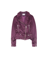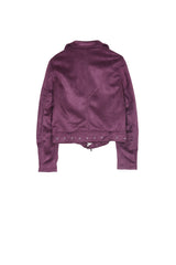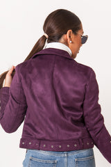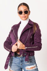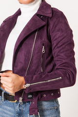 Damenjacke von Sixth June aus weichem Wildleder. Taschen und Reißverschluss vorne, Gürtel und Reißverschlüsse an den Ärmeln. Taillierter Schnitt. Lila Modell.
