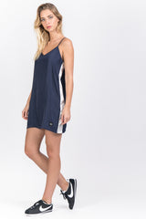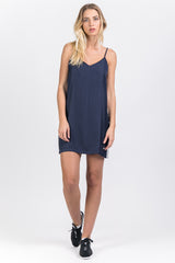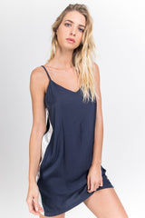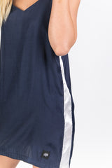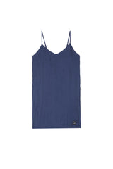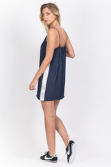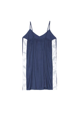 Damenkleid von Sixth June aus Satinmaterial und mit weißen Bändern an den Seiten. Leichtes Material, dünne Träger und kurzer Schnitt. Blaues Modell.