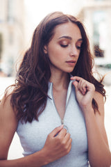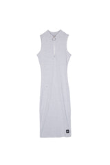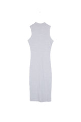 Kleid von Sixth June aus geripptem Stoff mit Reißverschluss vom Hals bis zur Brust. Figurbetonter Schnitt, ärmellos und hoher Halsausschnitt. Schlichtes hellgraues Modell.
