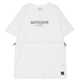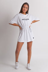 Kurzarmkleid für Damen der Marke Sixth June. Sixth June-Aufdruck in der schillernden Mitte (Glitzereffekt, darunter die Aufschrift „Sixth June Streetstyle Brand“). Kordelzug mit Gummizug in der Taille. Schmale Passform und überschnittene Schultern, Minilänge. Weißes Modell.