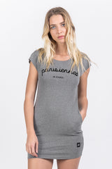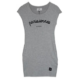 Sixth June Parisiennes graues Kleid. Aufschrift „Parisiennes de Paris“ aus schwarzem Samt. Diskrete Seitentaschen. Kurze Ärmel und Rundhalsausschnitt.