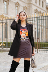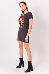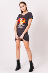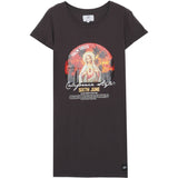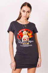 Sixth June T-Shirt-Kleid für Damen mit „Sixth June“, „California Style“ und Holy Virgin-Aufdrucken. Kurzer, taillierter Schnitt, Ärmelsäume und Rundhalsausschnitt. Schwarzes Modell.