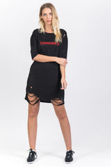 T-Shirt-Kleid mit Destroyed-Effekt für Damen von Sixth June, mit Löchern vorne und hinten, Rissen unten und einem zentralen SIXTH JUNE-Aufdruck in Gothic-Buchstaben. Weit geschnitten, mittellange Ärmel mit kleinem Saum. Schwarzes Modell und roter Aufdruck.