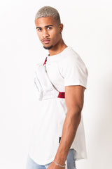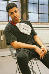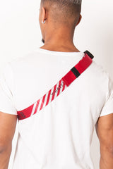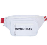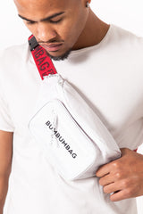 Bauchtasche für Damen und Herren mit aufgedrucktem Logo. Zwei Reißverschlussfächer, Slogan-Puller und sicherer Verschluss. Verstellbarer Schultergurt mit gestickten Aufschriften: „Bumbumbag“, „What's your Flavor“, „Frozen Wave Keep Under 0°F/.18°C“ und GPS-Koordinaten. Weißes Modell mit rotem Schultergurt. Abmessungen: 28x7cm.
