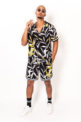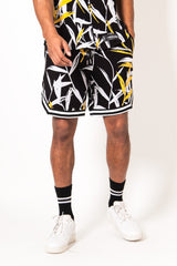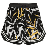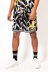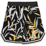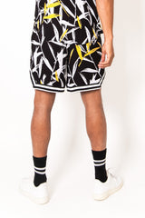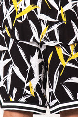 Sixth June-Shorts für Herren mit Allover-Palmblatt-Prints. Klassisch langer Schnitt, vom Basketball inspiriertes Design, Kordelzug und Gummizug in der Taille, Seitentaschen und eine Gesäßtasche, dreifarbige Bänder am Saum und V-förmige Öffnung am Saum an den Seiten. Schwarz-gelbes und weißes Muster.
