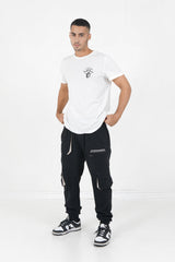 Großer Aufdruck auf der Rückseite mit Zeichnung eines Skeletts, das seinen Kopf hält, und Text, kleiner Aufdruck eines Skeletts auf der Vorderseite auf der Brust.