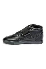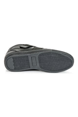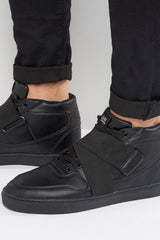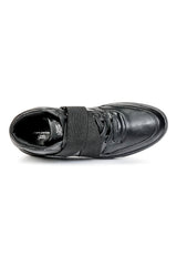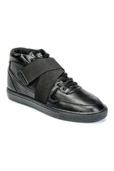 Schwarze Herren-Sneaker von Sixth June. Nation Strap-Modell. Leicht hoher Schnitt. Schwarze Außensohle und Schnürsenkel. Elastischer Riemen am Vorfuß. Sixth June-Logo auf der Zunge.