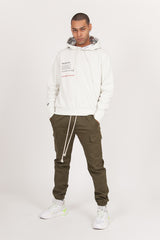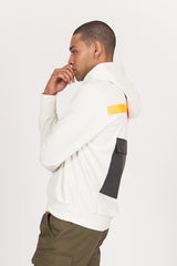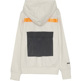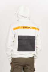 Herren-Kapuzenpullover der Marke Sixth June. Silberne Kapuzeninnenseite (Aluminiumeffekt), reflektierende Kängurutasche auf der Rückseite. Neonorangefarbener Menschenstreifen auf der Rückseite, Text auf der Vorderseite aufgedruckt. Klassischer Schnitt. Cremefarbenes Modell, leicht beige.