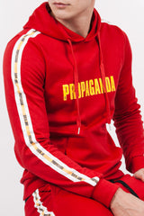 Sixth June Kapuzenpullover für Herren mit „Propaganda“-Aufdruck auf der Vorderseite. Schmale Passform, Kängurutasche, Kordelzug, zweifarbige Bänder mit Aufdruck „Sixth June“ und „Propaganda“ entlang der Bänder und taillierter Saum. Rotes Modell mit gelber Aufschrift.