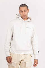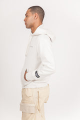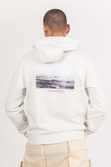 Herren-Hoodie der Marke Sixth June. Reflektierendes Logo auf der Vorderseite und am Ärmel, glänzender Effekt im Licht. Ozeanbild auf der Rückseite und Aufschrift „SIXTH JUNE / Streetstyle“ „28469 / 72362 PARIS FRANCE seit 2008“ auf der Rückseite. Kängurutasche, übergroßer Kordelzug an der Kapuze. Klassischer Schnitt. Weißes Modell, leicht gebrochen.