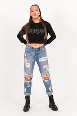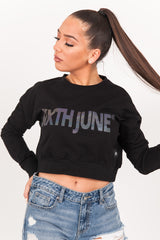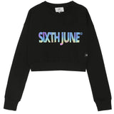 Langärmliges Sweatshirt für Damen der Marke Sixth June. Reflektierender „Sixth June“-Print mit Benzineffekt in der Mitte. Gummizug an Taille und Bündchen. Klassischer, kurzer Schnitt. Schwarzes Modell.