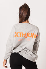 Übergroßes Sweatshirt der Marke Sixth June für Damen. Orangefarbener Sixth June-Aufdruck klein auf der Vorderseite und groß auf der Rückseite. Weiter Schnitt, überschnittene Schultern. Graues Modell.