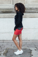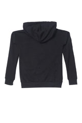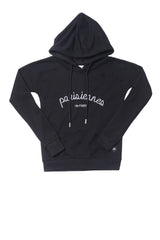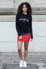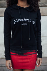 Schwarzes Damen-Sweatshirt von Sixth June. Destroyed-Effekt vorne und hinten. Aufschrift „Parisiennes de Paris“ auf der Vorderseite. Kapuze mit Kordelzug. Markenetikett unten links.