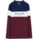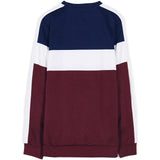 Dreifarbiges Herren-Sweatshirt von Sixth June mit großem Sixth June-Logo in der Mitte. Weiße Streifen entlang der Ärmel, klassischer Schnitt. Rot-blau-weißes Muster
