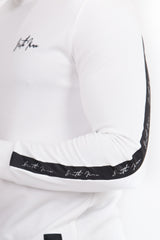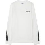 Sixth June-Sweatshirt für Herren mit Querstreifen auf der Rückseite. Klassischer Schnitt, Rundhalsausschnitt, aufgesticktes charakteristisches Logo auf der Vorderseite, zweifarbiger Querstreifen auf der Rückseite und an den Ärmeln mit durchgehend aufgedrucktem charakteristischem Sixth June-Logo auf dem Streifen. Weißes Modell.