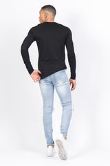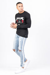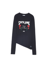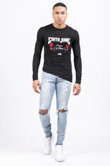 Herren-T-Shirt von Sixth June mit Aufdruck auf der Vorderseite: Metalllogo und Schriftzug „Love and Violence“ mit zwei gestickten Rosen. Lange Ärmel, taillierter Schnitt und unten asymmetrisch. Schwarzes Modell.