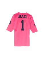 Sixth June T-Shirt für Damen mit BAD 1-Schriftzug auf der Vorder- und Rückseite und SJ auf den Ärmeln. Neoprenmaterial, übergroßer Schnitt und 3/4-Ärmel. Himbeerrosa Muster mit weißen Texten.