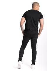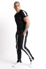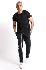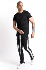 Herren-T-Shirt von Sixth June mit bedruckten Streifen von Sixth June Paris entlang der Ärmel. Klassischer Schnitt und kleiner Saum an den Ärmeln. Schwarzes Modell mit weißen Streifen.