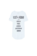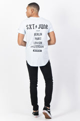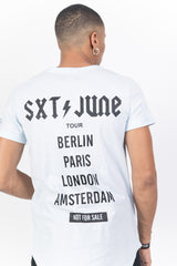 Herren-T-Shirt von Sixth June mit CREW-Aufdruck auf der Vorderseite, großem SXT JUNE TOUR BERLIN PARIS LONDON AMSTERDAM NOT FOR SALE-Aufdruck auf der Rückseite und kleinem STAFF RESPECT MY AUTHORITY-Aufdruck auf dem linken Ärmel. Klassischer Schnitt, abgerundeter Saum und kleiner Saum an den Ärmeln. Pastellblaues Modell mit schwarzem Aufdruck.