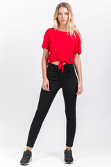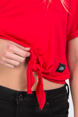 Crop-Top-T-Shirt für Damen von Sixth June zum Binden unten. Klassischer Schnitt, kurze Ärmel, leichtes Material und kleiner Saum an den Ärmeln. Rotes Modell.