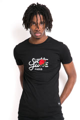 Herren-T-Shirt von Sixth June mit großem Logo-Print auf der Vorderseite und einem rosa Aufnäher in der Mitte. Enge Passform. Schwarzes Modell.