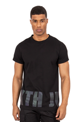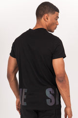 Kurzarm-T-Shirt für Herren der Marke Sixth June. Großer Sixth June-Druck mit reflektierendem Petroleum-Effekt (glänzender Effekt im Licht). Ärmelsäume. Klassischer Schnitt. Schwarzes Modell.