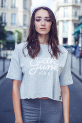 Damen-T-Shirt von Sixth June mit großem Sixth June-Logo auf der Vorderseite. Weiter geschnitten als ein klassisches T-Shirt, mit überschnittenen Schultern. Hellgraues Modell mit weißem Logo.