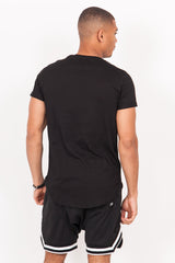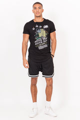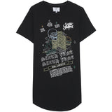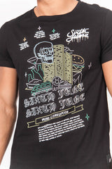 Sixth June T-Shirt für Männer mit verschiedenen Aufdrucken auf der Vorderseite (Totenkopf, Gebäude, Hamburger usw.). Klassischer Schnitt, abgerundeter Saum, „Sixth June“-Aufdruck in Gothic-Schrift und Ärmelsäumen. Schwarzes Modell.