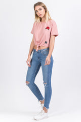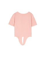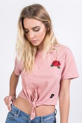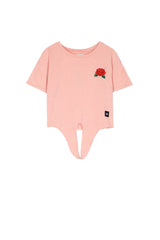 Damen-T-Shirt von Sixth June mit rosa Aufnäher auf der Brust. Klassisch, kurz geschnitten, mit Schleife unten und kleinem Saum an den Ärmeln. Rosa Modell.