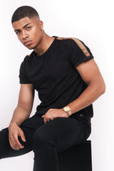 Herren-T-Shirt von Sixth June aus weichem Wildleder mit gesticktem Sixth June-Logo und einem Band an Schultern und Ärmeln. Klassischer Schnitt, abgerundete Ärmelsäume und Saum. Schwarzes Modell mit braunen Bändern.