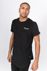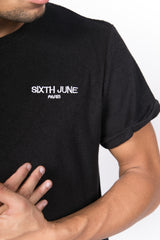Sixth June Herren-T-Shirt mit Material in Strandtuch-Optik. Kleines Logo auf der Brust, klassischer Schnitt mit abgerundeter Form unten und Saum an den Ärmeln. Schwarzes Modell.
