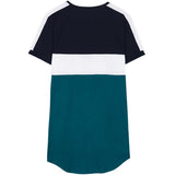 Dreifarbiges Herren-T-Shirt von Sixth June mit großem Sixth June-Aufdruck in der Mitte. Bänder entlang der Ärmel, klassischer Schnitt, abgerundeter Saum und Säume an den Ärmeln. Schwarzes Modell, entengrüne und weiße Streifen.