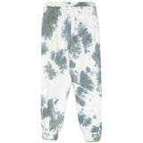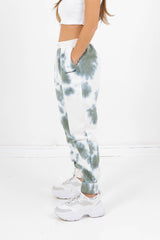 Damen-Jogginghose der Marke Sixth June. Tie-and-Dye-Print mit Farbnuancen. Aufgedrucktes Logo vorne am linken Bein, Vordertaschen, elastischer Bund mit Kordelzug, breite Gummibänder an den Knöcheln. Weiter Schnitt. Grünes Modell.
