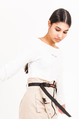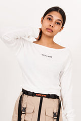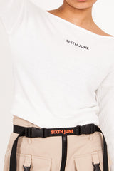 Damen-Langarmoberteil der Marke Sixth June. Weiter Ausschnitt, halb entblößte Schultern, Sixth June-Stickerei auf der Vorderseite. Mesh-Material. Klassischer, kurzer Schnitt. Weißes Modell.