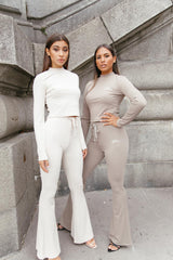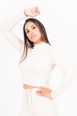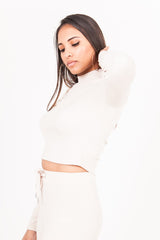 Damen-Langarmoberteil der Marke Sixth June. Stehkragen, charakteristisches Logo auf der Vorderseite aufgedruckt. Klassischer Schnitt, kurzer Crop-Top-Stil. Hellbeiges Modell.