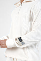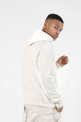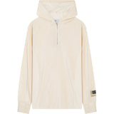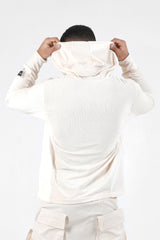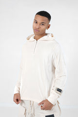 Herren-Hoodie der Marke Sixth June. Geripptes Material mit Samtimitat-Touch, weich und bequem. Reißverschlussöffnung am Kragen, gestickter Aufnäher am linken Unterarm mit QR-Code, der zur offiziellen Website weiterleitet. Beigefarbenes Modell.