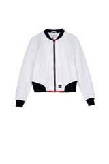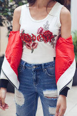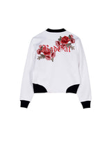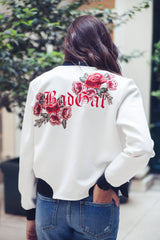 Damenjacke von Sixth June, bestickt mit Rosen und Bad Gal auf der Rückseite. Klassischer Schnitt und zwei Seitentaschen. Weißes Modell mit roter und grüner Stickerei, schwarzen Gummibändern und rotem Innenfutter.