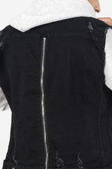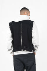 Ärmelloses und Denim-Material. Seiten- und Brusttaschen, Knopf- und Reißverschluss hinten.