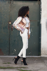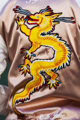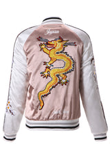 Sixth June Damen-Souvenirjacke, zweifarbig, Teddyjacke. Muster an den Ärmeln. Auf der Rückseite ein Drache mit japanischer Inschrift. Seitentaschen. Futter an den Manschetten.