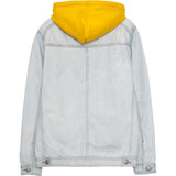 Herrenjacke von Sixth June aus Denim-Material, mit integrierter gelber Baumwollkapuze und kleinen Farbflecken an den Ärmeln und vorne. Knopfverschluss und taillierter Schnitt. Blaues Modell mit gelber Kapuze.