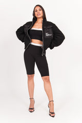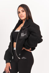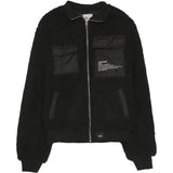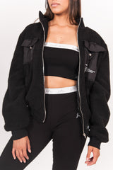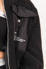 Übergangsjacke für Damen von Sixth June. Sherpa-Material (Lammfellimitat). Cargotaschen mit Druckknopf vorne, Satineffekt. Aufgedruckter Text auf der linken Tasche, Seitentaschen, Gummizug an Kragen und Saum, Reißverschluss. Weiter Schnitt. Schwarzes Modell.