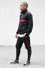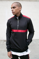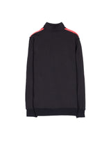 Herrenjacke von Sixth June aus Sportbekleidungsmaterial mit Satinbändern. Klassischer Schnitt mit halber Reißverschlussöffnung vorne und kleinem Kragen. Schwarzes Modell mit burgunderfarbenen Bändern.