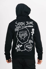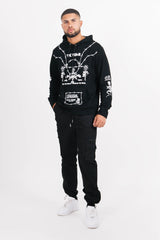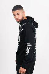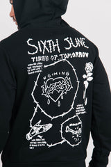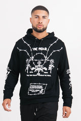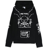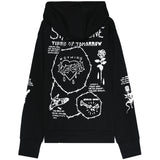 Auf der Vorderseite ist ein von Stacheldraht umgebener Schlüssel mit Rosen und Texten auf der Tasche bedruckt. Aufschriften auf den Ärmeln mit Rosen und Schlangen, Aufdruck auf der Rückseite, der ein gebrochenes Herz darstellt, umgeben von Stacheldraht, Rosen, Dolchen und anderen Details, Kängurutasche, Kordelzug an der Kapuze.