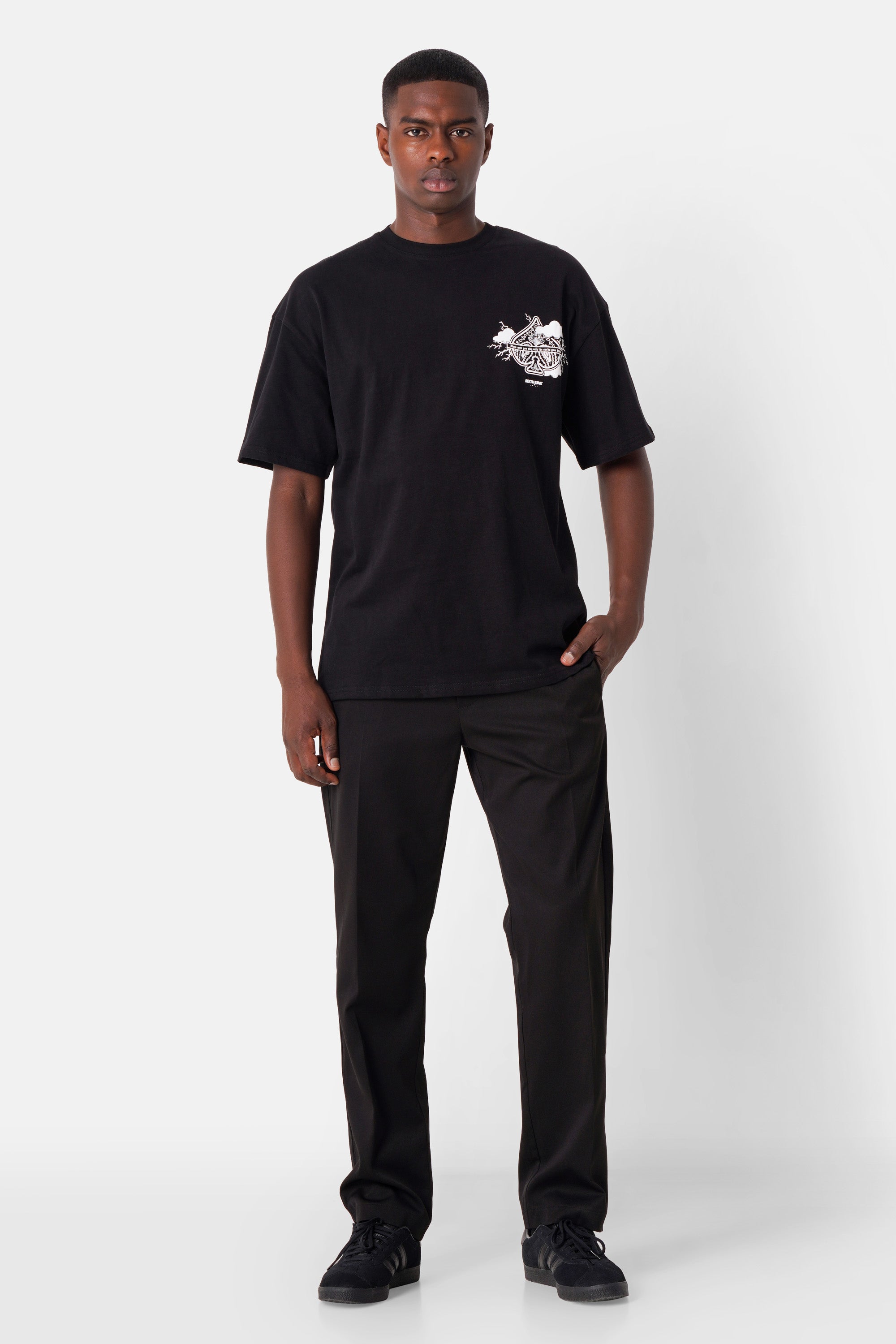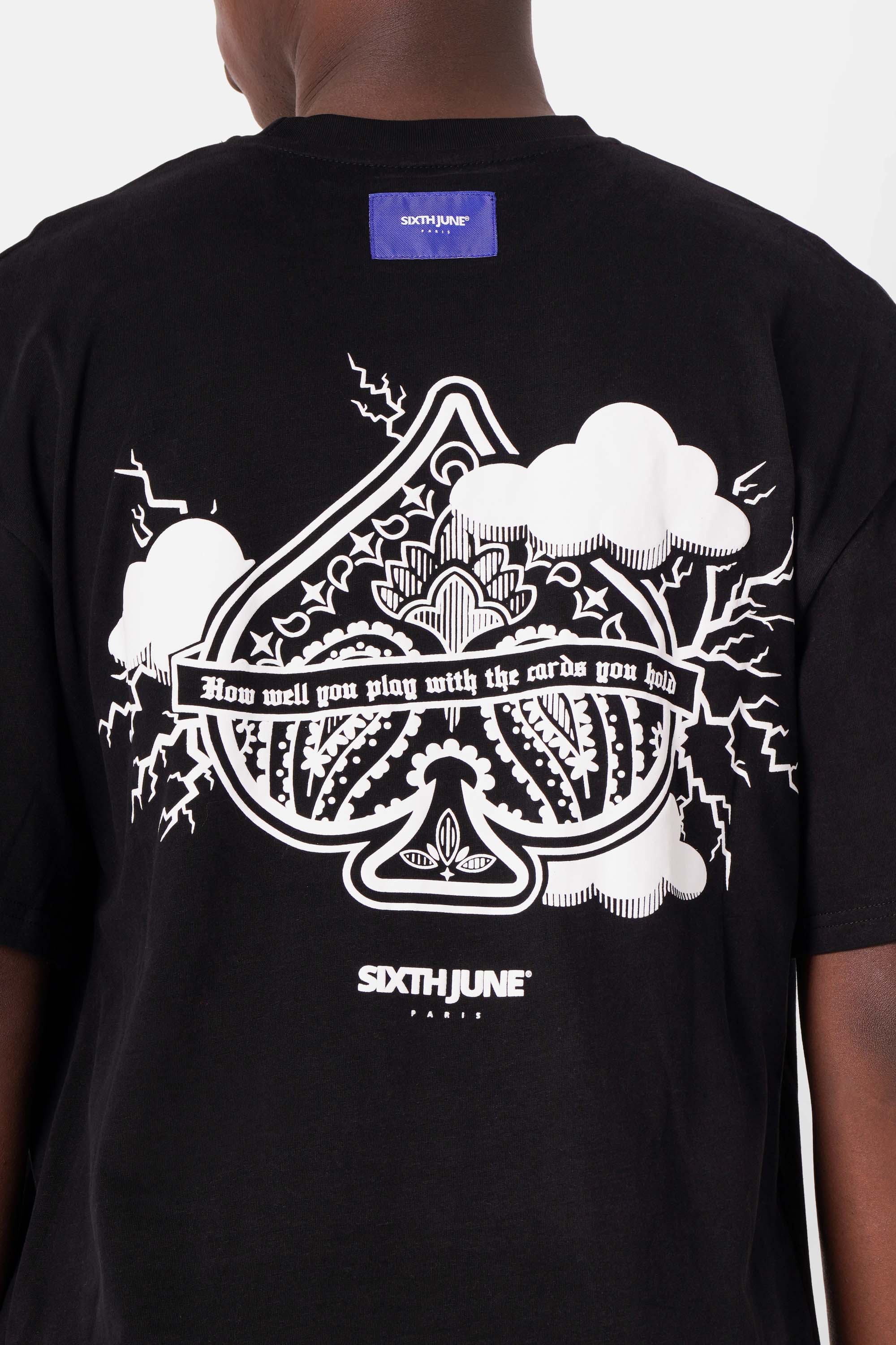 Large Ace of Spades print on the back and small on the front.