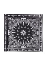 Sixth June bandana, with a Paisley print and gothic logo on one side. Square form and semi-thick fabric. Black model.