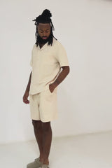 Crepe fabric, fluid fabric, front pocket, central button closure.