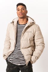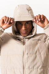 Sixth June short puffer jacket for men. Velvet imitation fabric and integrated hood. Sixth June printed on the chest, side pockets, inner pocket. Regular cut. Beige design.