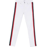 Sixth June jeans for men with red and green satin stripes on the sides. Super skinny cut. White model.