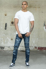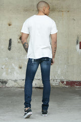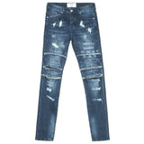 Sixth June men jeans with seams on the legs and holes with yoke inside. Destroyed and washed-out, skinny cut. Dark blue model.